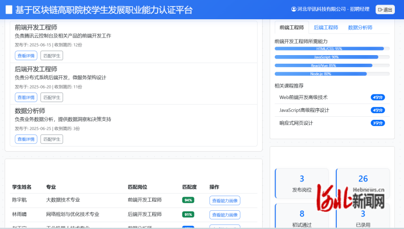 河北新闻网讯(张妍、于春梅)近年来,在深化产教融合、推动职业教育高质量发展的背景下,唐山海运职业学院积极探索人才培养质量提升路径,以区块链技术为支撑,打造区块链赋能高职院校学生发展的“三链融合”职业能力认证模式,并依托配套的职业能力发展平台,构建起连接学生、教师、企业与管理员的育人生态系统。